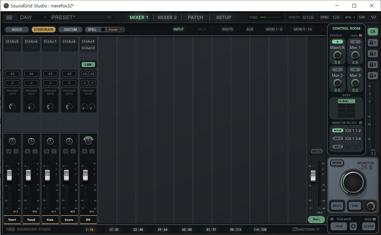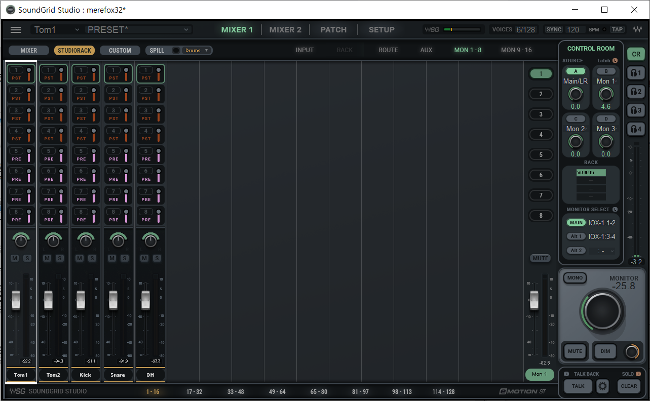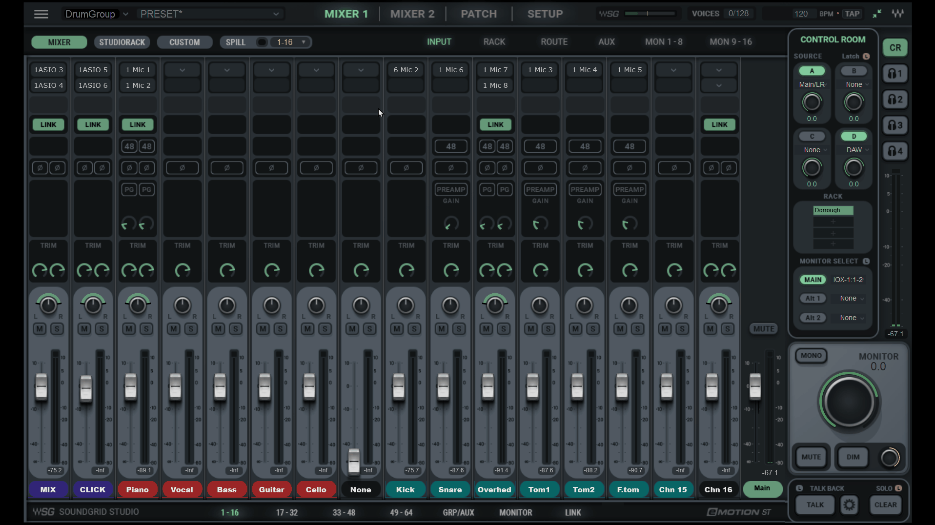 믹서 채널은 주로 DAW 의 아웃풋을 연결하거나 소프트웨어 어플리케이션의 아웃풋을 연결해서 사용하게 되고, 녹음 용 인풋 채널을 구성해서 사용할 수도 있기도 하고1) 여러가지가 가능하다. StudioRack 채널 은 DAW 에서 사용한 StudioRack 들이 각각 채널로 넘어와서 StudioRack 페이지에서 통합 컨트롤 하는 믹서로 동작하게 된다.