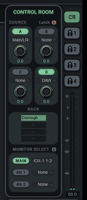 믹서의 오른쪽에는 Control room 기능이 있어서 다수의 스피커와 헤드폰을 연결하여 소스를 골라서 사용할 수 있다.