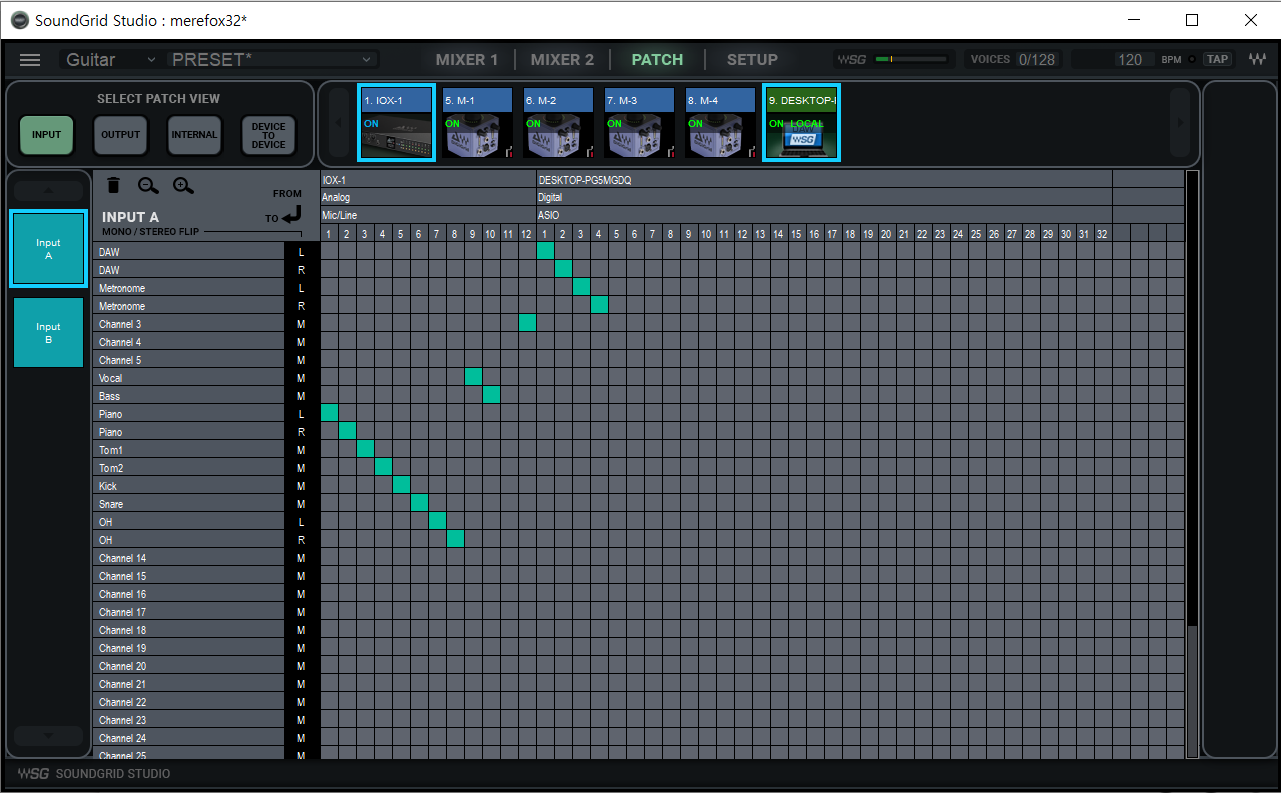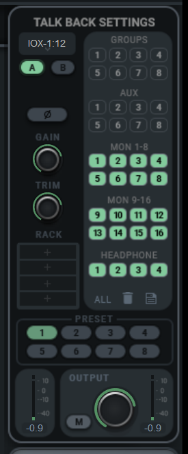 이러한 라우팅은 Patch 화면에서도 똑같이 동작되는 것을 확인 가능하다. 인풋은 A/B 의 두가지 셋팅을 전환 가능하고, 아웃풋은 선택 가능한 8개의 서브 그룹과 1개의 메인 버스가 있다.