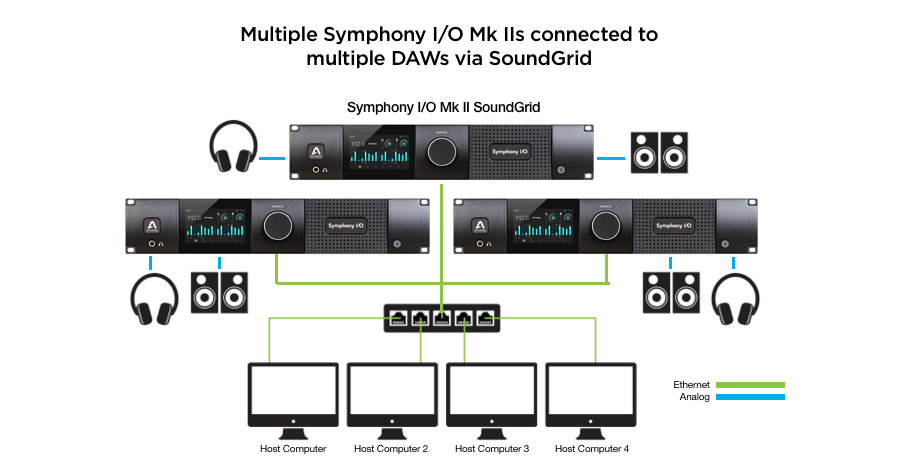 전용의 SoundGrid 지원 오디오 인터페이스를 사용하면, 플러그인을 DSP로 사용하는 것 뿐만 아니라, 녹음할 때도 모니터링 시 플러그인을 걸고 Zero latency로 사용하는 것까지도 가능하다. 네트워크를 사용하는 오디오 인터페이스이기때문에, 워드 클럭이 따로 필요 없고, 연결하면서 자동으로 클럭이 동기화 되며 확장된다. 총 64인풋 64아웃풋까지 가능한 것으로 알고 있다. 지금 현재 SoundGrid I/O 중 가장 하이엔드 모델은 아포지의 심포니 I/O mk21)이다.