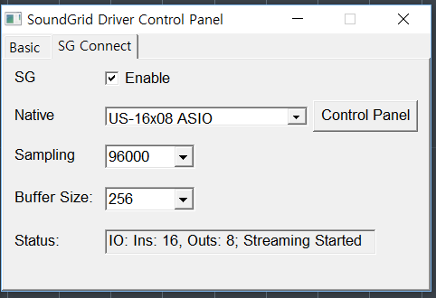 SG driver 에서 위와 같이 SoundGrid Connect 를 활성화 할 수 있다. TASCAM US16X08