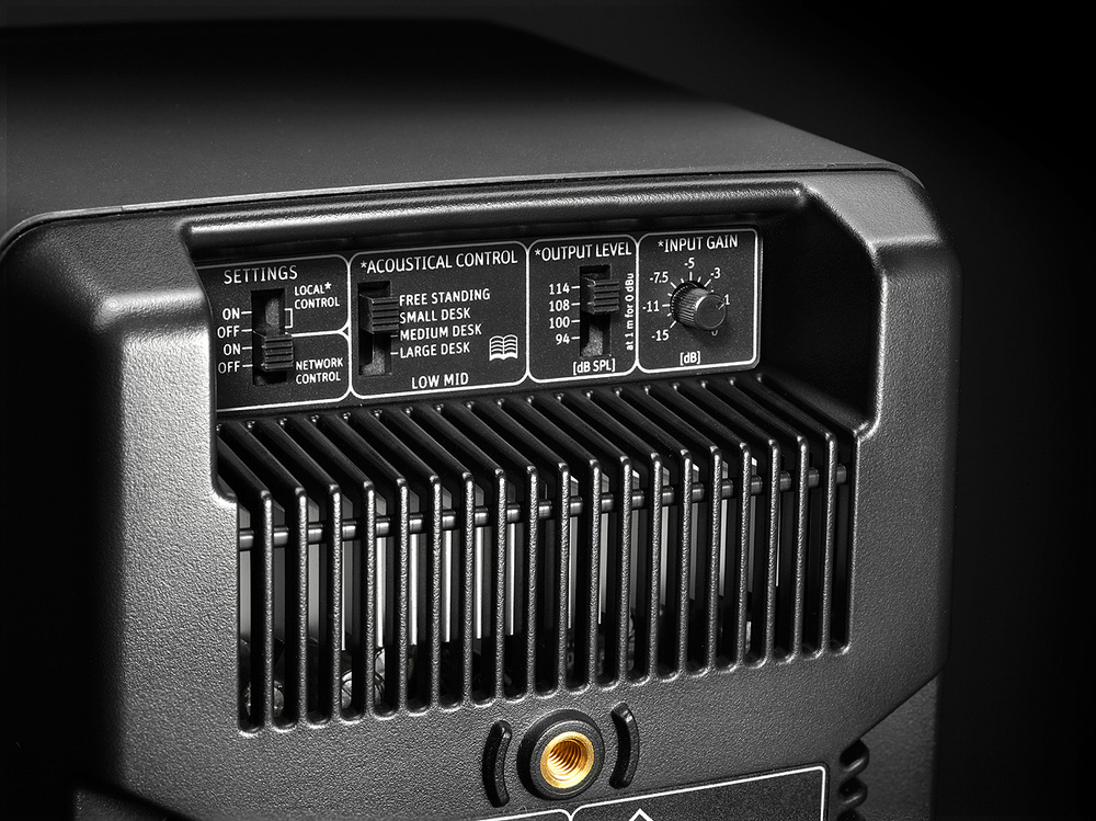 - 후면 패널 사용자 컨트롤: 로터리 입력 감도 트리머는 최대 15dB의 감쇠를 제공하며, 4 위치 슬라이드 스위치와 함께 작동하여 0dBu 입력 신호에 대한 공칭 SPL(1미터에서 측정)을 114, 108, 100 또는 94dB SPL로 설정합니다. 두 번째 4방향 슬라이드 스위치는 로우-미드 EQ 컷을 도입하고(280Hz에서 중심, 0, 1.5, 3 또는 4.5dB 감쇠), 이는 데스크톱 또는 콘솔에서의 배치에 대한 음향 효과를 보정하기 위한 것입니다. 세 번째 슬라이드 스위치는 자동 대기 모드를 구성하고 로컬 또는 네트워크 제어를 선택합니다.