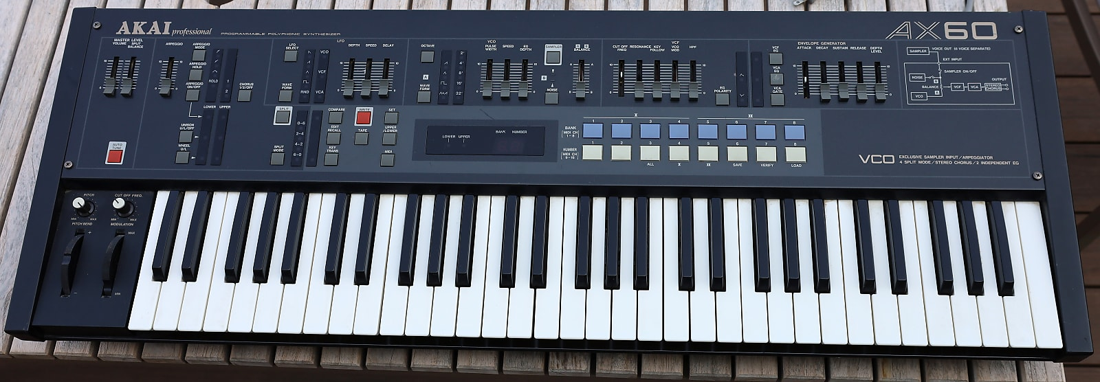 AX60은 1980년대 중반의 마지막 진정한 아날로그 폴리신스 중 하나입니다. 이는 Roland Juno 시리즈와 Yamaha의 새로운 디지털 DX 시리즈에 대한 Akai의 답이었습니다. AX60은 프로그래머블한 6음성 신디사이저로, 멋진 LFO, 저역 통과(VCF) 필터, 엔벨로프 섹션 등 다양한 기능을 제공합니다. 8음성 버전인 AX80도 이미 출시되어 있었습니다.