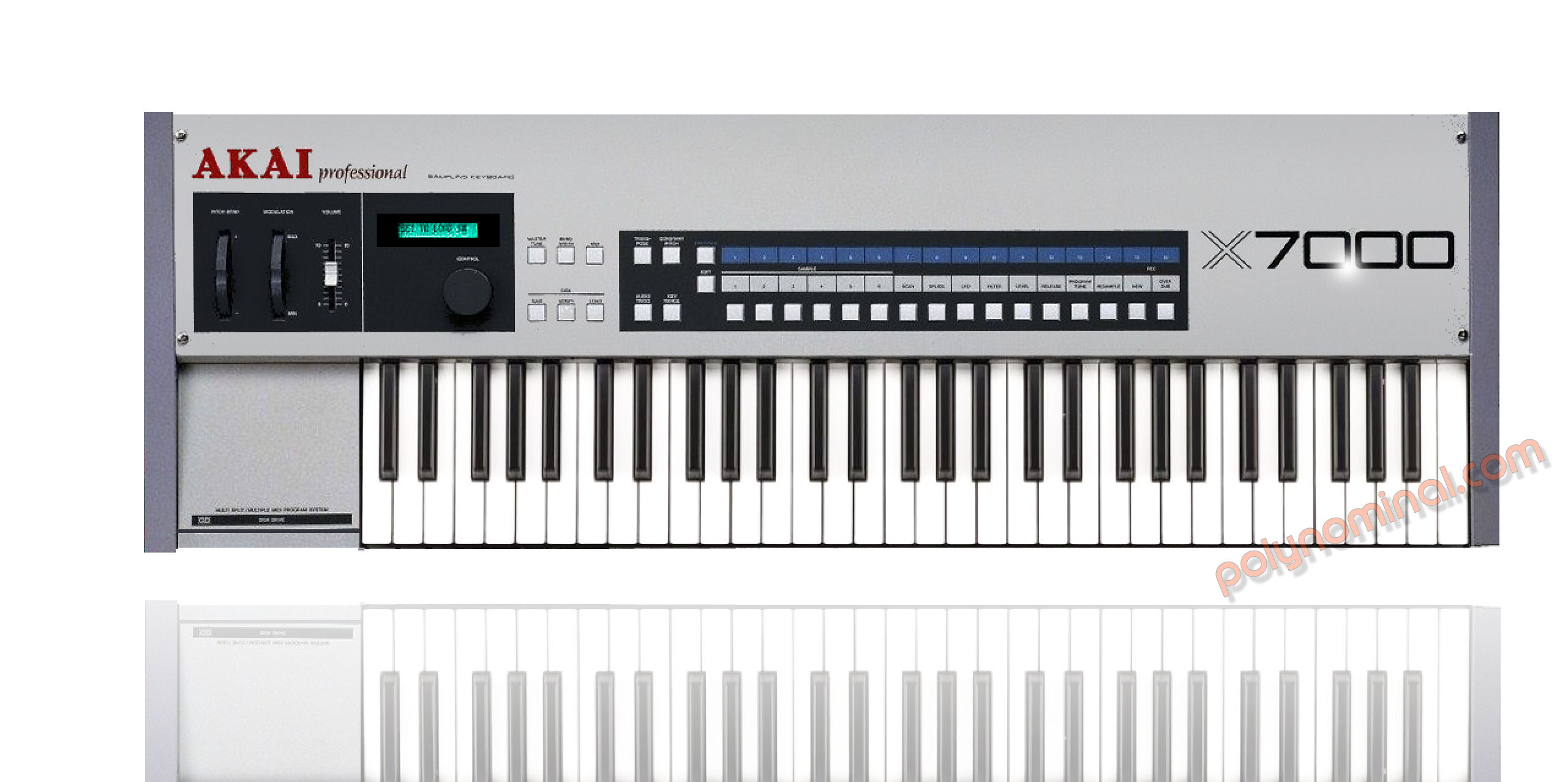X7000은 Akai의 첫 번째 주요 샘플러 키보드 악기로, E-mu Emax, Ensoniq Mirage, EPS, Roland S-10 같은 샘플링 키보드와 스타일과 형식이 유사합니다. X7000은 1986년에 훌륭했던 랙 마운트형 S-900과 거의 동일한 샘플링 기능을 갖추고 있습니다. 12비트 샘플링(최대 40kHz), 128KB RAM(몇 초 분량의 샘플만 저장 가능), 루프, 자동 루프, 잘라내기, 멀티 샘플링 및 리샘플링, 튜닝 등 기본적인 샘플 편집 기능 전체가 포함되어 있습니다. 또한 키보드 상단에는 LFO 및 기타 모듈레이션에 빠르게 액세스할 수 있는 몇 가지 전용 파라미터 버튼이 있습니다.