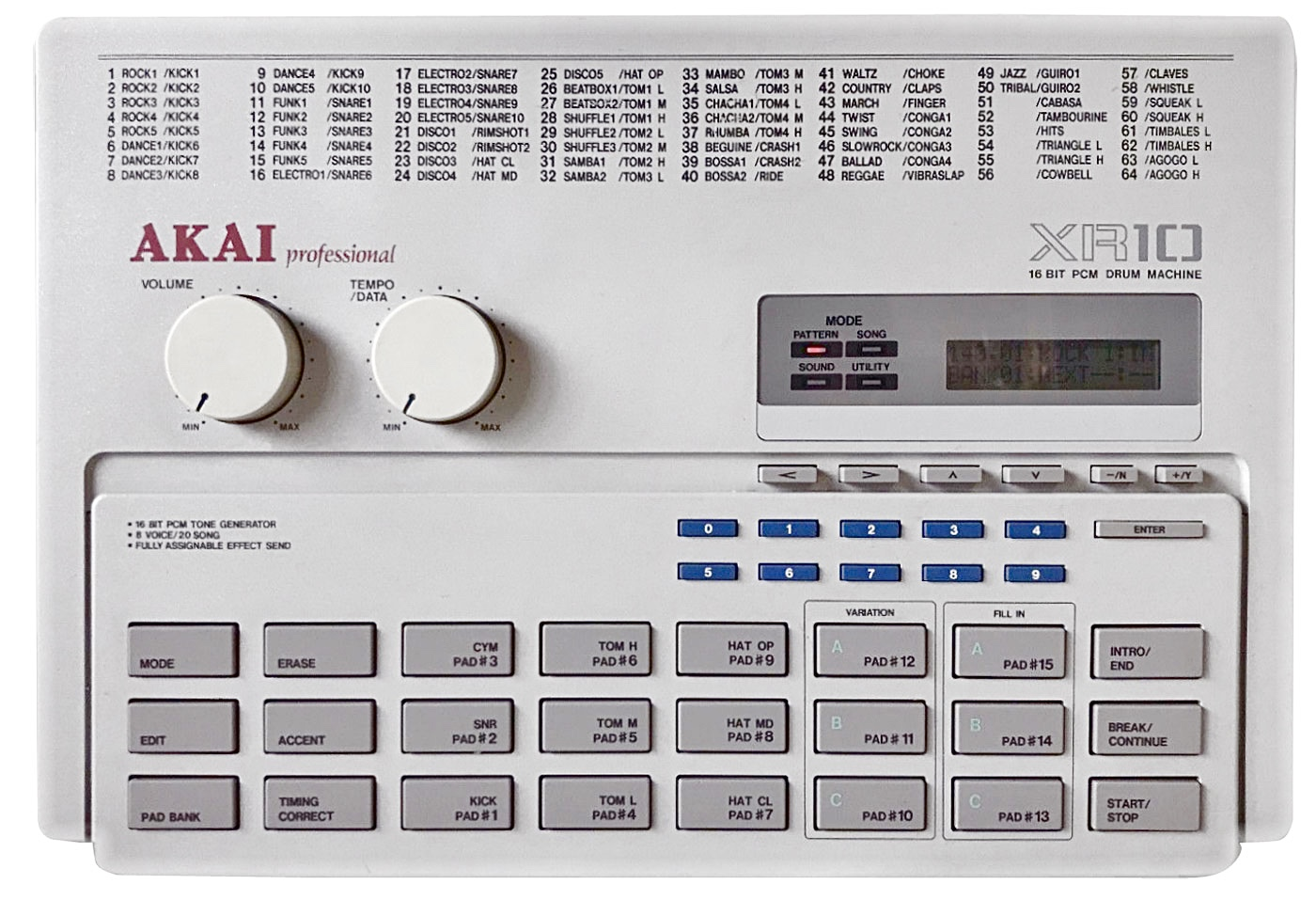 Akai XR10은 1.7kg의 꽤 묵직한 케이스에 담겨 있으며, 왼쪽에는 볼륨과 템포/데이터 다이얼이, 오른쪽에는 LCD 화면이 배치되어 있습니다. 상단은 리듬 프리셋 목록이 표시되는 곳입니다. LCD는 16자까지 두 줄로 표시할 수 있지만, 아쉽게도 백라이트 기능은 없습니다. 화면 아래에는 화살표 및 예/아니오 버튼과 숫자 키패드가 있습니다. XR10의 하단 절반은 모드 전환, 편집 기능 접근 및 사운드 트리거를 위한 여러 개의 고무 패드로 구성되어 있습니다. 불행히도 이 패드는 다이내믹하지 않지만, 전용 버튼을 통해 패드 뱅크를 쉽게 전환할 수 있습니다.