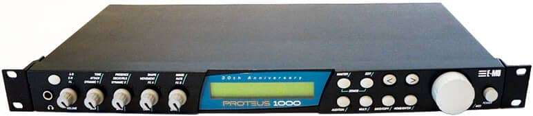 Proteus 1000은 Proteus 2000 랙 모듈(및 Proteus 2500 포함)의 더 슬림하고 저렴한 버전입니다. 폴리포니는 128에서 64음으로 줄어들었습니다. Proteus 2000 및 2500과 동일한 32MB “Composer” 사운드셋을 제공합니다. 그러나 Proteus 1000은 추가 사운드셋 확장 슬롯이 단 하나만 제공되며, 다른 Proteus 모델들이 네 개의 슬롯을 제공하는 것과 차이가 있습니다. 따라서 메모리는 최대 64MB까지 확장 가능하며, E-mu의 장르 기반 사운드 모듈, 데스크톱 그루브 머신 및 키보드 라이브러리에 있는 11개의 사운드셋 중 하나만 선택할 수 있습니다.