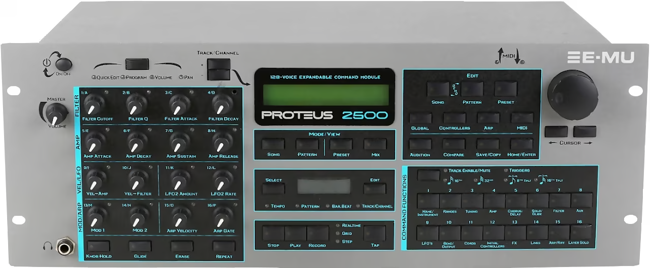 Proteus 2500에는 16트랙 MIDI 시퀀서가 내장되어 있으며, 각 트랙당 16개의 MIDI 채널을 제공합니다! 선형 및 패턴 기반 녹음, 실시간 또는 단계별 녹음, 아날로그 그리드/드럼 머신 스타일 프로그래밍 등 다양한 기능을 지원합니다. Proteus 2000과 달리, Proteus 2500은 16비트 대신 24비트 DAC 출력을 제공하여 향상된 음질을 제공합니다. 또한 MIDI 프로세서가 새롭게 설계되어 Proteus 2000보다 3배 더 효율적입니다! 이 외에도 6개의 오디오 출력, S/PDIF 디지털 출력 및 USB 포트를 제공합니다. 이는 현재까지 출시된 Proteus 중 가장 강력한 모델로, E-mu의 주력 신디사이저 모듈로 오랫동안 자리 잡을 가능성이 높습니다.
