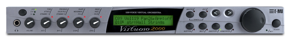 Virtuoso 2000은 128보이스 오케스트라 모듈로, 64MB 이상의 사운드를 갖추고 있어 한 칸의 랙 공간에 전체 오케스트라를 담고 있습니다! E-mu의 “Orchestral Session” 사운드세트 1&2를 특징으로 하며, 바이올린, 비올라, 첼로, 더블베이스, 트럼펫, 프렌치 혼, 트롬본, 베이스 트롬본, 튜바, 피콜로, 플루트, 오보에, 잉글리시 혼, 클라리넷, 베이스 클라리넷, 바순, 컨트라바순, 하프, 오케스트랄 벨, 튜블러 벨, 벨 트리, 셀레스테, 실로폰, 마림바 및 20개 이상의 악기로 구성된 퍼커션 배터리 등 멋진 사운드를 제공합니다! 128개의 보이스, 32개의 MIDI 채널, 신속한 MIDI 응답 및 1,000개 이상의 사운드로 가장 큰 오케스트라 앙상블을 만들 수 있습니다!