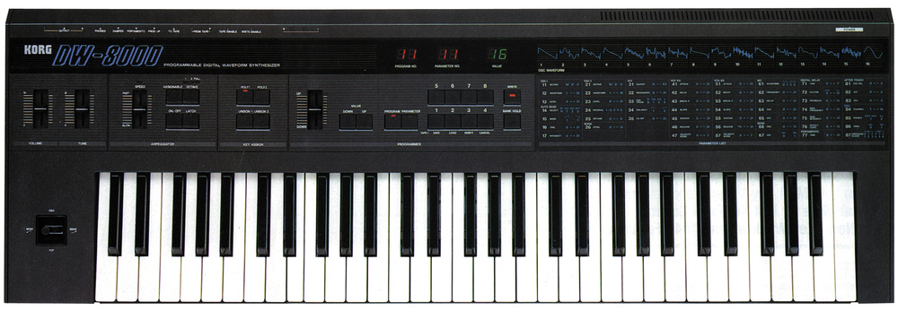 Korg의 첫 번째 디지털 제어 아날로그 신디사이저 하이브리드(DW-6000)를 두 단계 높이면 더 인기 있는 DW-8000이 됩니다. 소리는 DWGS(디지털 파형 생성 시스템)에서 디지털로 생성되며, 8개의 샘플 디지털 파형에서 16개의 간단한 아날로그에서 복잡한 디지털 파형으로 두 배로 늘어났습니다. DW-8000은 두 가지 모드에서 8음 폴리포니를 제공하며, 모든 여덟 개의 음을 겹쳐 사용하는 단일 모노포닉 모드를 제공합니다. 아날로그 VCF 공진 필터와 VCA는 모두 독립적인 ADBSSR 엔벨로프를 가지고 있습니다. 파라미터는 단일 프로그래머블 슬라이더를 통해 실시간으로 변경할 수 있습니다. 사용자에 의해 재프로그래밍할 수 있는 64개의 프리셋이 있습니다.