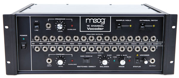 1979년 Moog는 자체적인 보코더를 출시했는데, 그 디자인과 구조는 거의 Bode 7702 보코더와 동일합니다. 이는 16밴드 아날로그 보코더로, 주어진 신디사이저 사운드(캐리어 신호)를 50에서 5080주파수 대역으로 분리합니다. 내부 오실레이터는 없으며 외부 캐리어와 변조 신호원(모듈레이터)을 처리하는 장치로 설계되었습니다. 모듈레이터는 일반적으로 보컬이나 드럼 비트가 사용되어 캐리어/신디사이저 사운드를 변조하는 데 사용됩니다.
