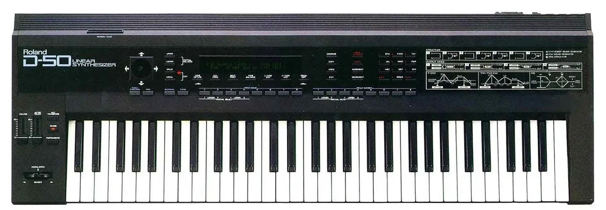 Roland D-50은 1987년에 Roland에 의해 생산 및 출시된 폴리포닉 61키 디지털 신디사이저입니다. 이 신디사이저는 Linear Arithmetic synthesis, 내장 이펙터, 조작을 위한 조이스틱, 그리고 아날로그 합성 스타일의 레이아웃 디자인을 특징으로 합니다. Roland PG-1000(1987-1990) 프로그래머를 D-50에 연결하면 더 복잡한 사운드 조작이 가능합니다. 또한, 약 450개의 사용자 조절 가능한 파라미터를 갖춘 랙 마운트 변형 디자인인 D-550(1987-1990)도 제작되었습니다. 현재 D-50은 빈티지 신디사이저로 여전히 매우 인기가 높습니다.