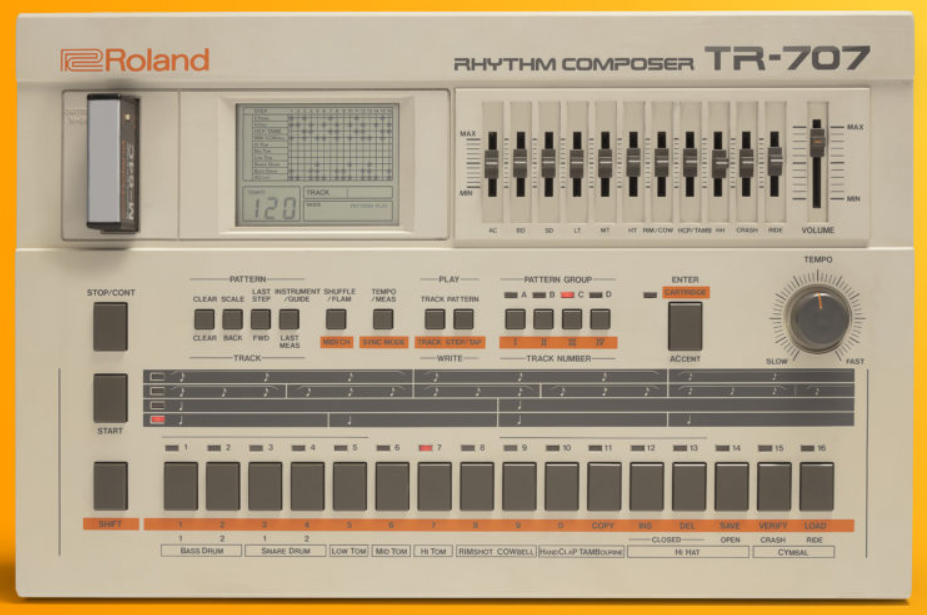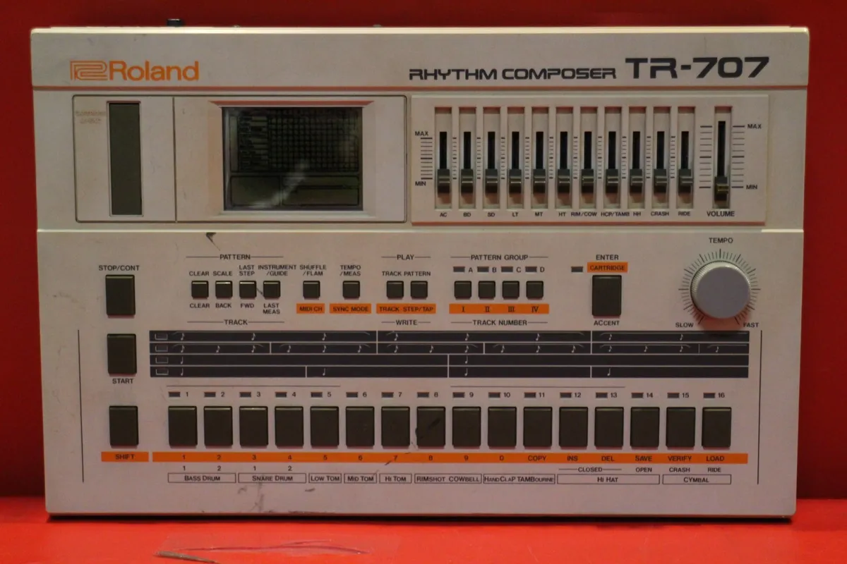 매우 과소평가된 드럼머신! TR-909과 유사한 외형을 가졌으며, 더 좋은 점은 그의 하이햇, 싸이벌 및 박수 사운드가 TR-909과 거의 동일하다는 것입니다! TR-707은 저렴한 909 샘플의 좋은 원천입니다. 특히 매트릭스 디스플레이는 패턴을 쉽게 읽을 수 있는 디스플레이 패널에 패턴을 명확하게 나타냅니다. 또한 MIDI 입력/출력 및 DIN 싱크 제어를 모두 갖추고 있어 두 마지막 세계를 모두 이용할 수 있습니다. 이 장치에는 각 드럼 톤에 대한 개별 출력까지 있습니다!