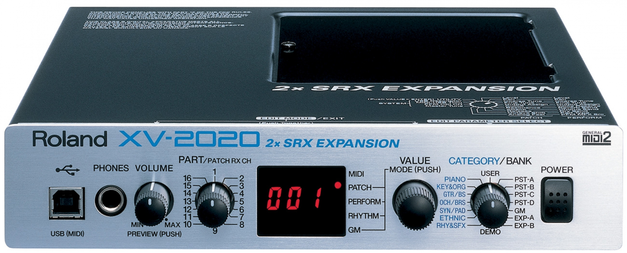 Roland XV-2020은 XV-5080의 고품질 사운드를 하프 랙 사이즈에 집약한 64-보이스 멀티팀버 신디사이저 모듈입니다. 1083개의 웨이브폼(64MB 메모리)과 4톤 구조의 강력한 합성 엔진을 탑재했으며, USB 연결로 간편하게 컴퓨터와 연동 및 에디팅이 가능합니다. SRX 시리즈 웨이브 익스펜션 보드를 2개까지 추가해 최대 192MB까지 확장할 수 있습니다.