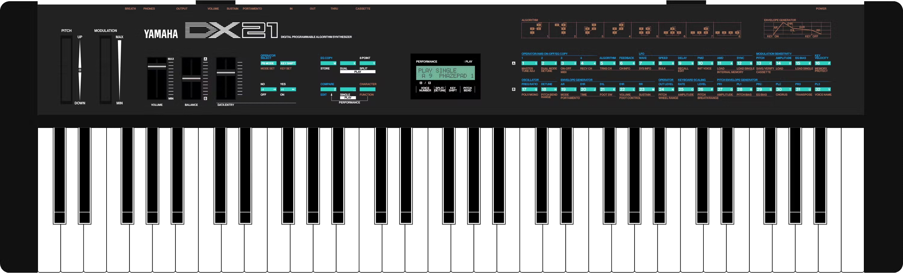 1983년에 Yamaha에서 출시한 디지털 신디사이저입니다. DX7은 주파수 모듈레이션(FM)을 정말 잘 활용하는 최초의 대량 생산 신디사이저이자 대량 판매되는 최초의 디지털 신디사이저였습니다. 이 신디사이저는 소개된 이후 7년 동안 Yamaha의 전체 키보드 라인의 방향을 정의했습니다. 10만 개가 넘는 판매량을 기록하여 현재까지도 역사상 가장 많이 판매된 신디사이저로 남아 있습니다. 이 제품은 1983년에 제작 및 출시되었습니다.