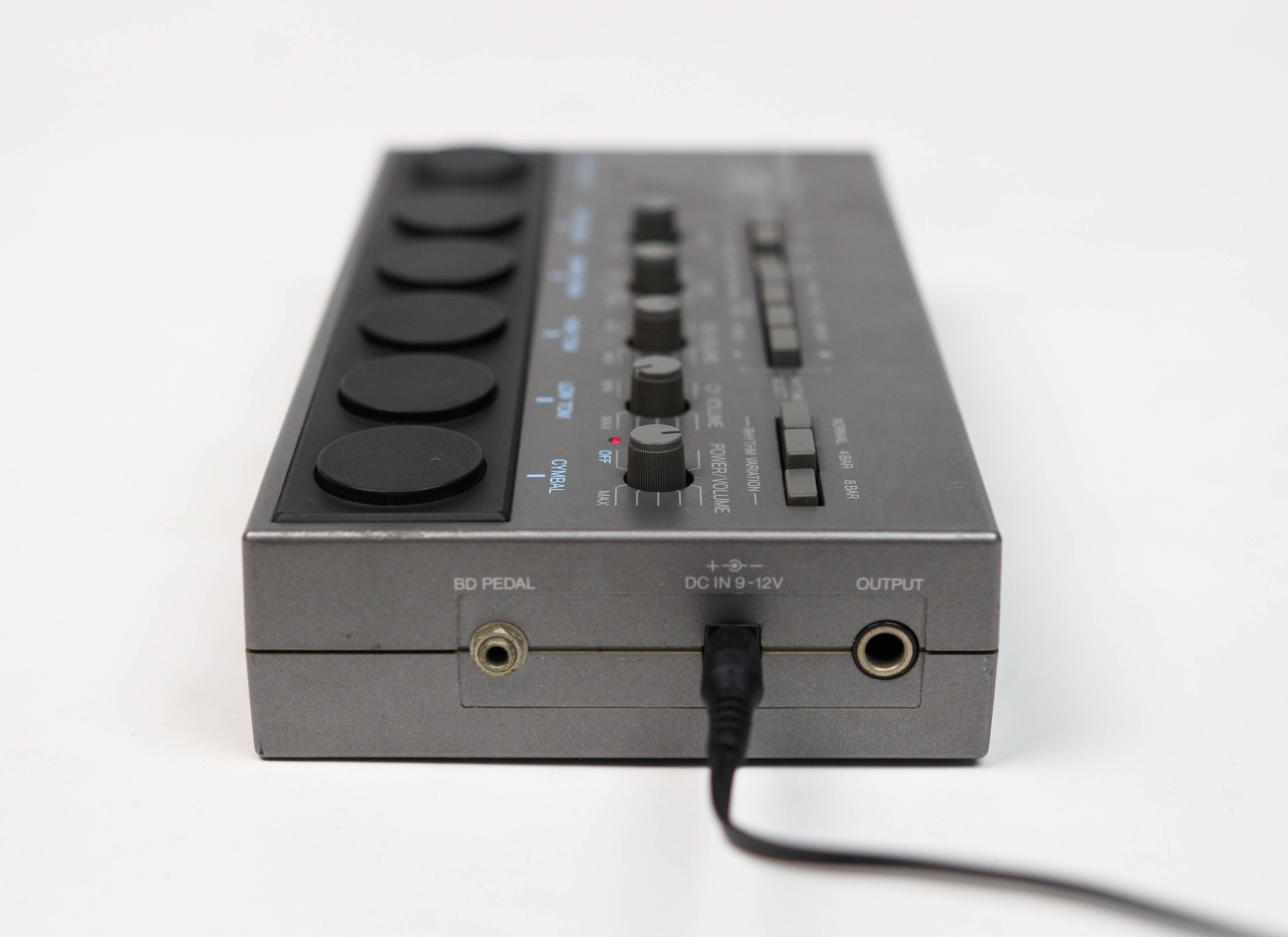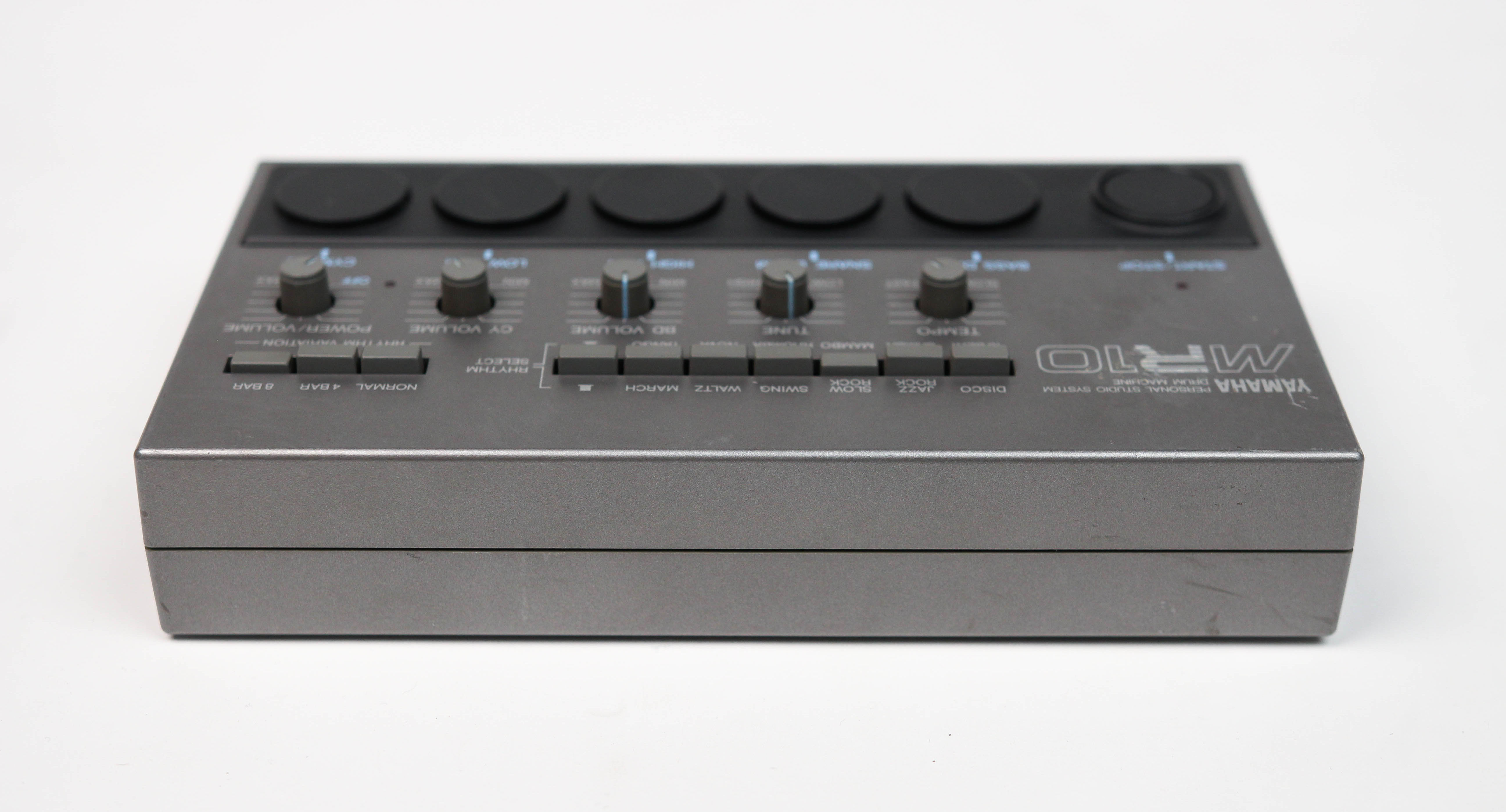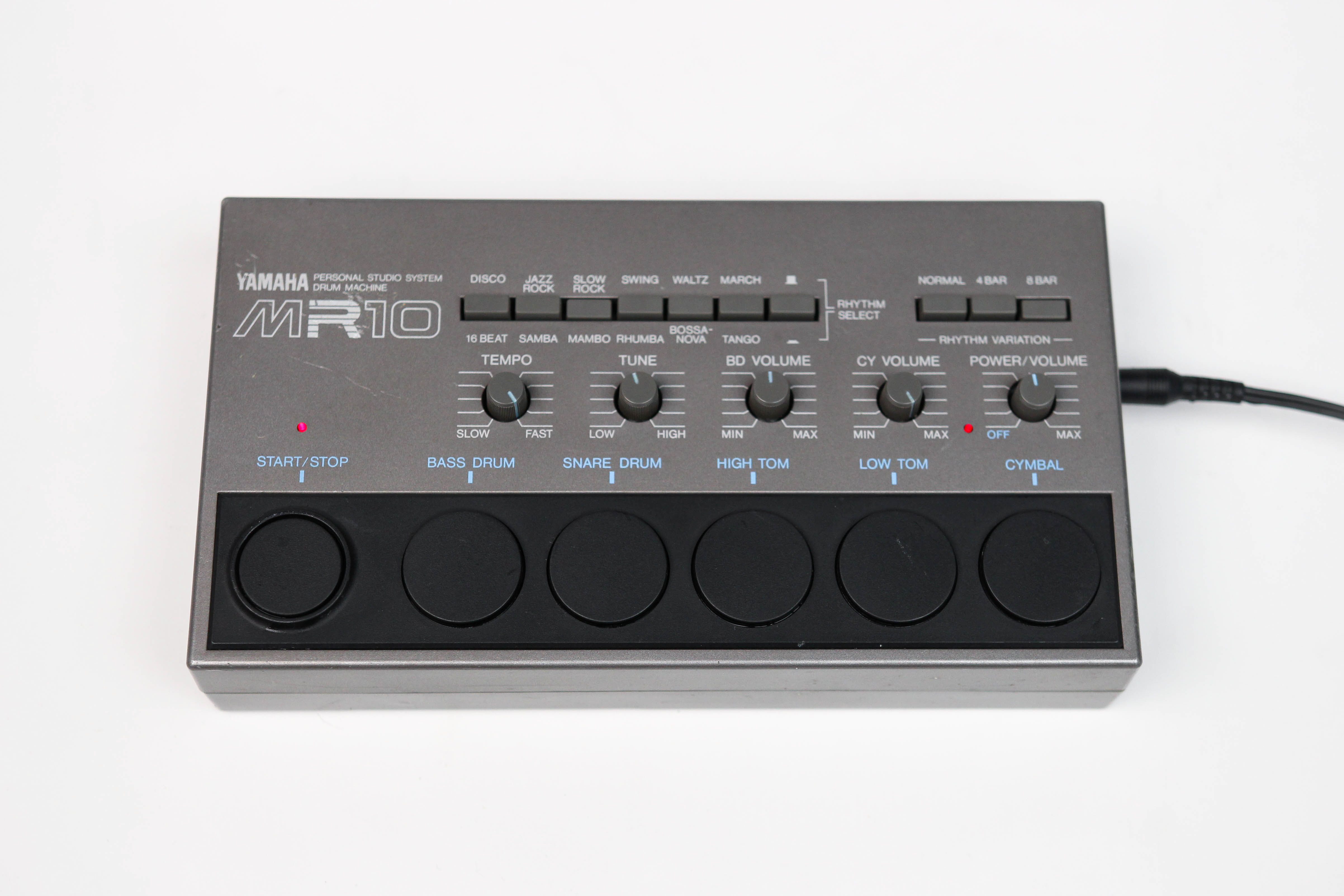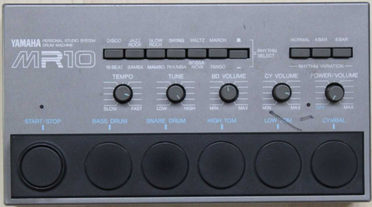 Yamaha MR10은 1982년에 출시된 Yamaha의 유일한 아날로그 드럼 머신으로, 'Producer' 시리즈의 일부입니다. 소형 데스크탑 크기와 손가락 터치 패드 컨트롤, 내장된 12가지 프리셋 리듬, 독특한 빈티지 퍼커션 사운드를 특징으로 합니다.
