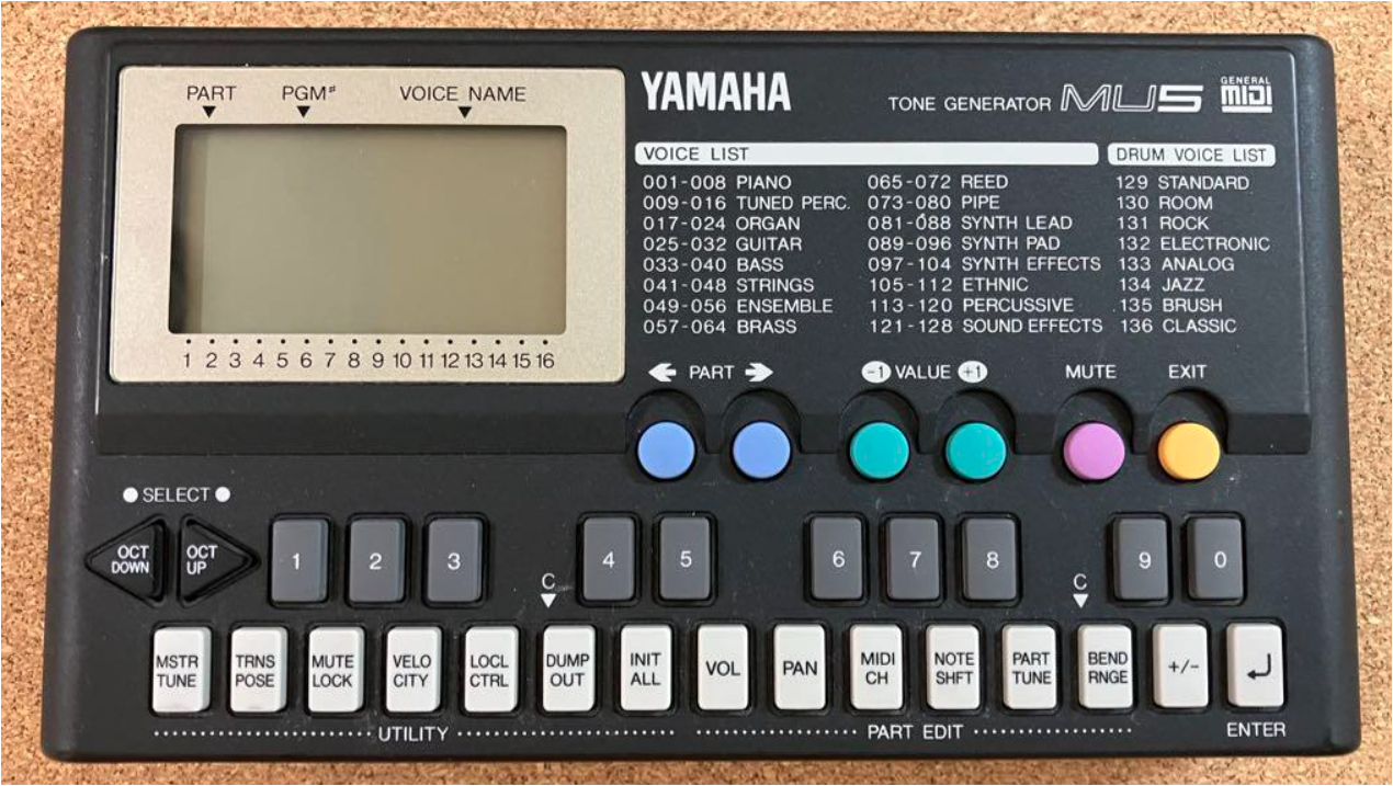 Yamaha MU5는 1990년대 중반 출시된 초소형 GM(General MIDI) 사운드 모듈로, 비디오 테이프 크기의 박스에 28음 폴리포니, 16파트 멀티팀브럴, 128개의 GM 음색(8 드럼 키트), Mac/PC 연결 인터페이스, 2옥타브 미니 키보드, 배터리/어댑터 겸용 전원 등 “언제 어디서나 음악 제작“을 실현한 미니멀 GM 신스입니다.