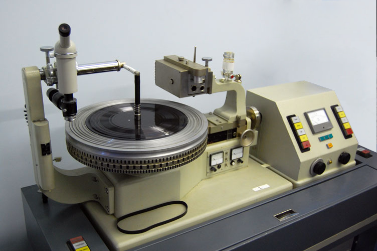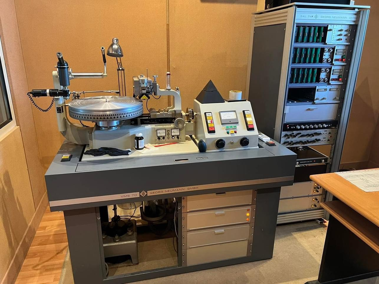 디스크 마스터링 래스 (1970년대). 모노/스테레오 레코드 커팅을 위한 컴퓨터 제어 시스템 탑재. 40년 Neumann 노하우가 집약된 VMS80 전신으로 최대 표면 활용 자동화.