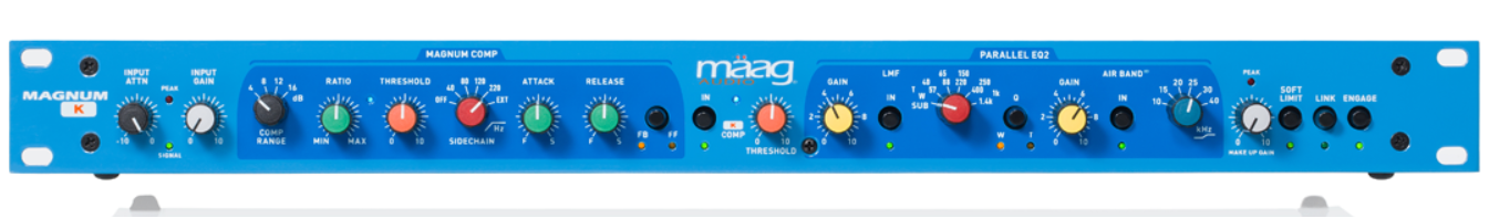 Mäag Audio Magnum-K는 듀얼 옵티컬 컴프레서(Magnum + K-Comp)와 병렬 EQ2(Air Band 포함)를 결합한 혁신적 1U 싱글 채널 프로세서입니다. 리본 마이크 트래킹부터 믹스버스까지 다용도 4-in-1 디자인으로 현대 워크플로 최적화.