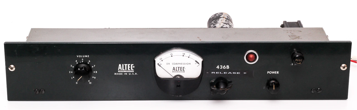 Altec 436B는 1950년대 Altec Lansing에서 개발한 빈티지 튜브 컴프레서/앰프(CompAmp)로, EMI RS124의 기반이 된 전설적인 vari-mu 컴프레서입니다. 방송과 스튜디오에서 자동 볼륨 컨트롤 장치로 사용되었으며, 부드럽고 음악적인 컴프레션으로 유명합니다.