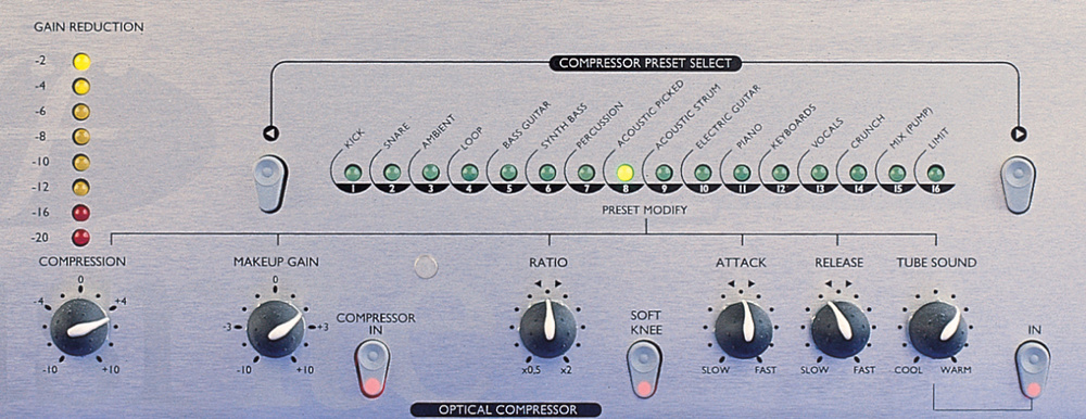 - 컨트롤: Compression(Threshold), Ratio/Attack/Release(중심 디텐트 ±조절)