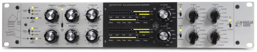 Gainlab Audio GLA-OC1 Governor는 혁신적인 듀얼 슬로프(2 Threshold) 밸브 광학 컴프레서입니다. Soft/Medium/Hard 3모드와 Tube Boost(Full/Air)로 트랜지언트/서스테인 정밀 제어하는 2U 듀얼 채널 마스터피스입니다.