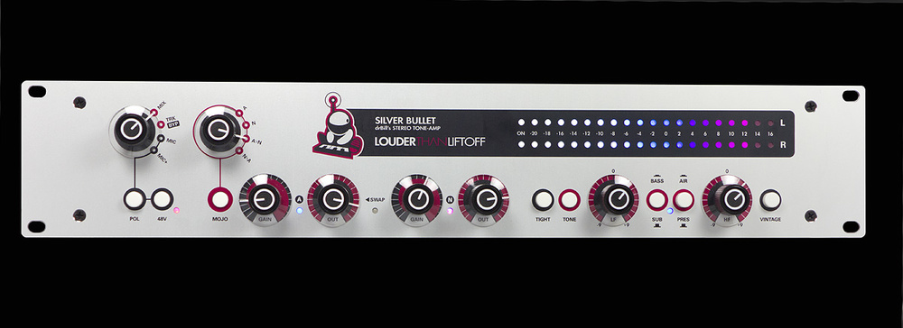 Louder Than Liftoff Silver Bullet은 스테레오 톤 앰프입니다. API/Neve 듀얼 Mojo + Pultec EQ로 하이브리드 워크플로를 $2099에 구현한 2U 랙입니다.