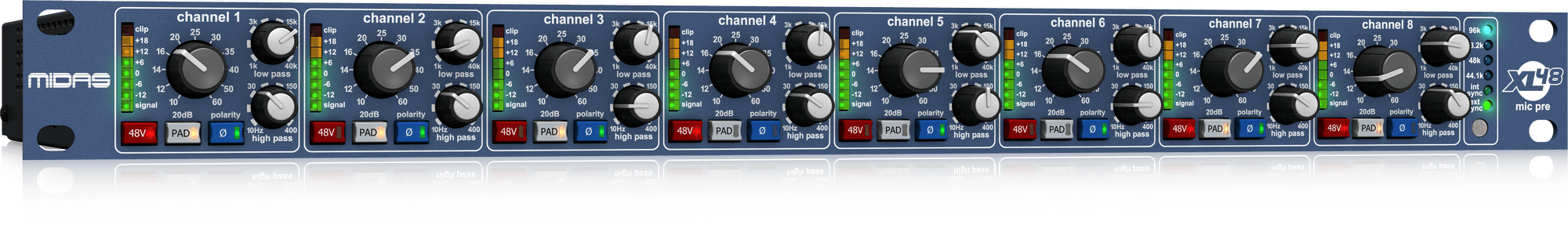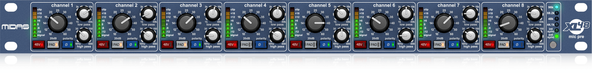 Midas XL48은 Midas의 전설적인 XL4 콘솔 프리앰프 회로를 1U 랙마운트에 8채널로 구현한 고성능 마이크 프리앰프/AD 컨버터입니다. 아날로그와 디지털 세계를 모두 아우르는 다목적 솔루션으로, 라이브, 스튜디오, 레코딩 등 다양한 환경에서 활용됩니다.