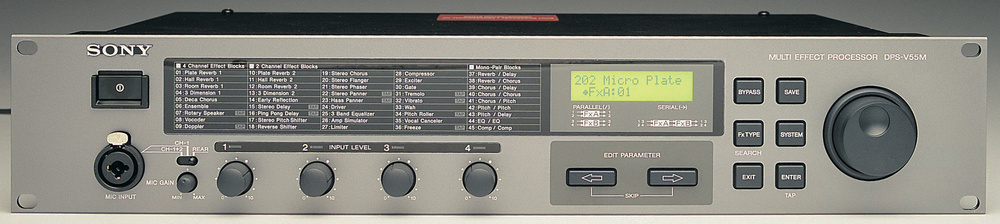 Sony DPS V55M은 1990년대 후반 출시된 4채널 멀티이펙트 프로세서로, 합리적인 가격대에서 뛰어난 음질과 유연한 입출력, 강력한 이펙트 알고리즘을 제공하는 2U 랙마운트 장비입니다. 4채널 서라운드, 듀얼 스테레오, 싱글 스테레오, 4모노 등 다양한 입출력/이펙트 구조로 동작하며, 200개의 공장 프리셋과 200개의 사용자 메모리를 지원합니다.