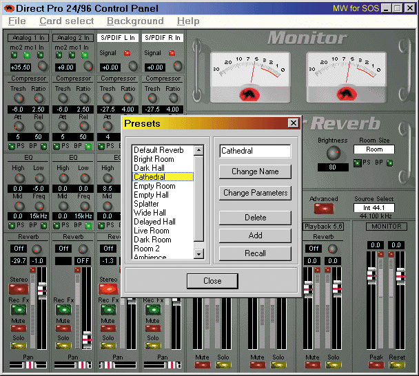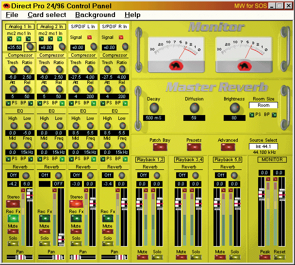 Direct Pro 24/96은 사운드 카드와 breakout box의 조합으로, 4개의 고품질 마이크/라인 프리앰프, 레코딩 및 모니터링에 사용 가능한 4개의 EQ 및 컴프레서 섹션, 모니터 리버브를 제공합니다. 모든 이펙트는 24비트 80MIPS DSP 엔진에서 실행되므로 메인 프로세서의 성능을 소비하지 않으며 소프트웨어 레이턴시가 발생하지 않습니다. Direct Pro는 3개의 스테레오 아날로그 출력, S/PDIF 입출력, MIDI 입출력을 제공하며, 모든 오디오 I/O는 24비트/96kHz로 작동합니다. 최대 4개의 장치를 드라이버 소프트웨어에서 실행하여 최대 16개의 동시 오디오 입력 및 24개의 출력을 제공할 수 있습니다.