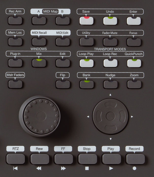 새로운 컨트롤에는 저장 버튼이 포함되어 있습니다. 이 스위치를 두 번 누르면 Pro Tools의 파일 메뉴에서 저장을 선택하는 것과 같습니다. 또한 Mem Loc 스위치는 Pro Tools 세션의 모든 메모리 로케이션에 액세스하고 이를 불러올 수 있도록 합니다.