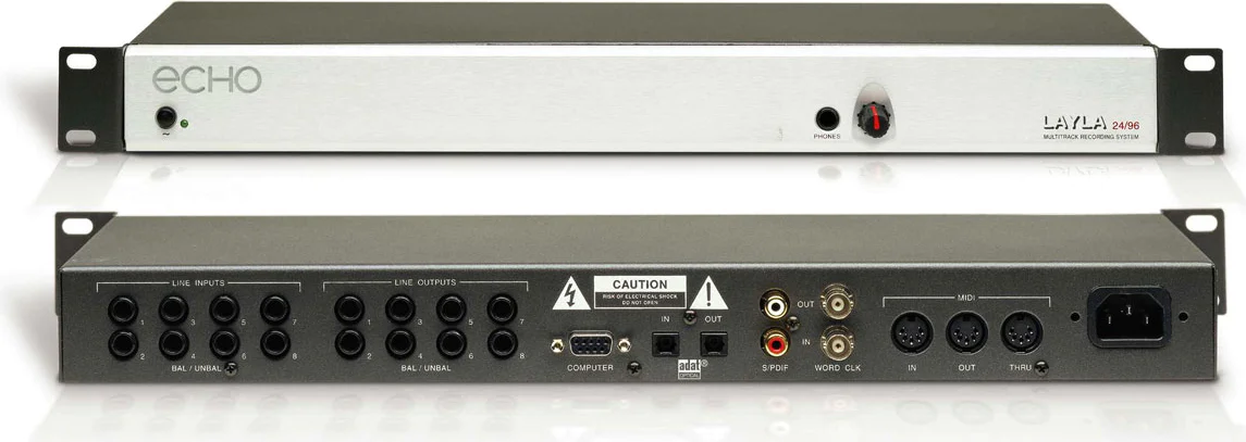 Echo Layla 24는 24비트/96kHz 지원, 8채널 동시 입출력, 다양한 디지털 I/O를 갖춘 PCI 오디오 인터페이스로, 하드디스크 기반 멀티트랙 레코딩 환경에 적합한 전문가용 장비입니다.