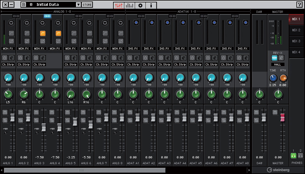 Cubase를 사용하지 않는 경우 모니터 믹싱 및 라우팅은 'dspFxMix UR824' 컨트롤 패널에서 처리됩니다. 이 컨트롤 패널은 4개의 독립적인 스테레오 모니터 믹스를 제공하지만 창 크기를 조정할 수 없으며 모든 채널을 표시하기에 충분히 크지 않습니다. 각 믹스는 UR824의 24개 입력 채널과 스테레오 DAW 재생 채널을 사용할 수 있습니다. 채널은 페이드, 패닝, 뮤트, 솔로 및 Rev-X 리버브로 전송할 수 있습니다. 인접한 채널을 연결하여 스테레오 채널을 형성할 수도 있습니다. 각 채널에는 컴프레션과 3밴드 EQ로 구성된 스위트 스팟 모핑 채널 스트립이 있습니다.