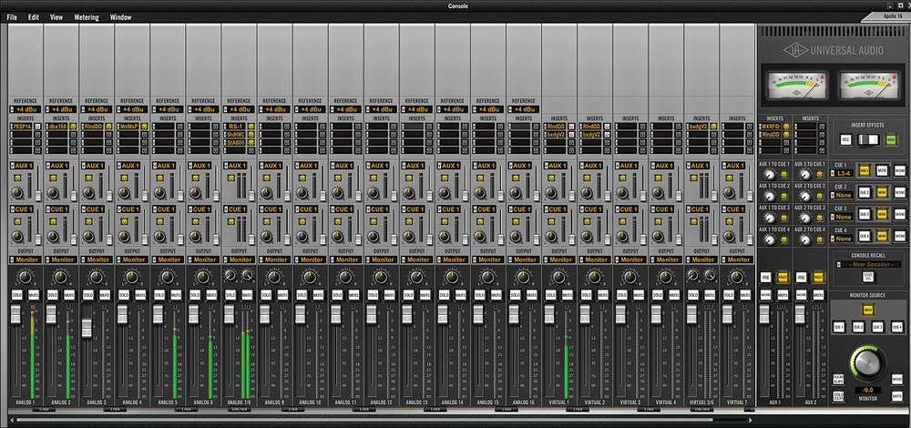 * 모니터링: Apollo의 마이크 프리앰프와 관련된 컨트롤이 없고, Apollo 16의 Console은 Apollo의 헤드폰 버스 대신 독립적인 출력 쌍으로 전송할 수 있는 4개의 스테레오 Cue 버스를 제공합니다. * 보조 버스: 2개의 스테레오 Aux 버스가 유지됩니다 (176.4 또는 192kHz 샘플레이트에서 Aux 2를 잃음). * 입력 채널: 각 입력 채널에는 4개의 프리페이더 인서트 슬롯이 있습니다. * 글로벌 Rec/Mon 스위치: 모든 채널 인서트를 모니터 경로에만 배치할지, 오디오와 함께 인서트 효과를 인쇄할지를 전환합니다.