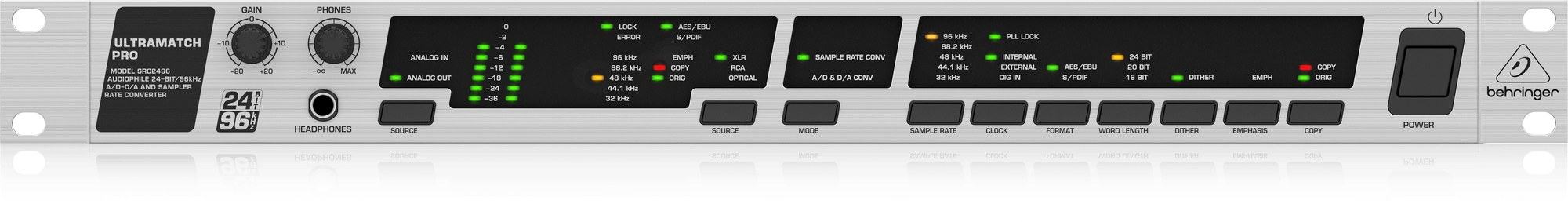 Behringer SRC2496 Ultramatch Pro는 24비트/96kHz A-D-D-A 컨버터이자 샘플레이트/포맷 컨버터로, 다양한 디지털 오디오 장비 간의 신호 전송, 포맷 변환, 지터 제거, 동시 A-D-D-A 변환 등 다양한 기능을 제공하는 합리적 가격대의 “디지털 오디오 스위스아미나이프”입니다.