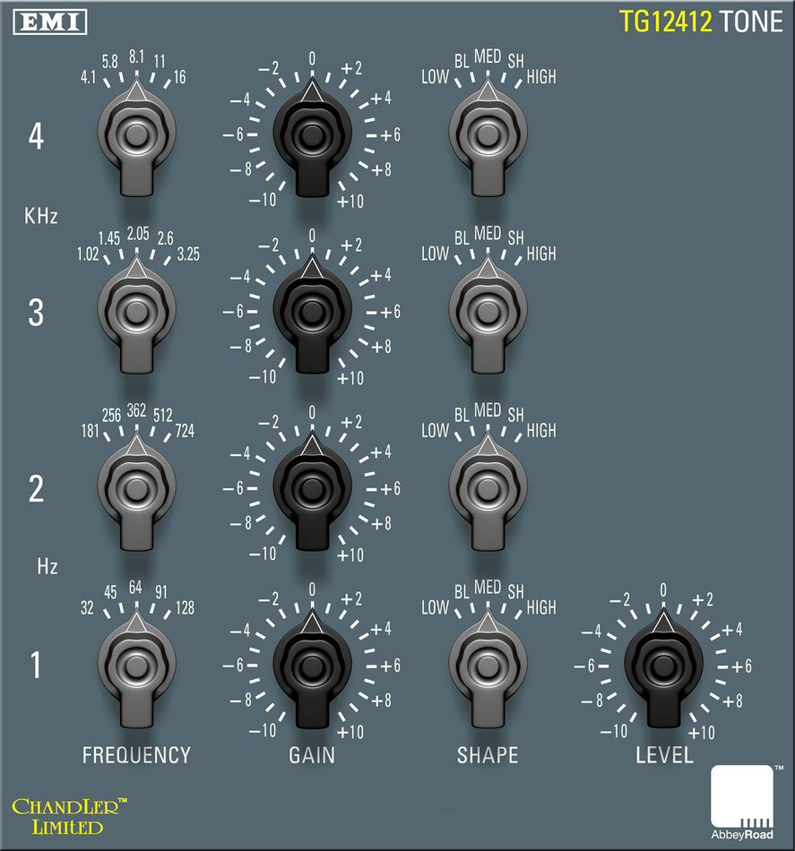 EQ는 4개 밴드에 20가지 선택지를 제공하며, 각 밴드마다 셸프 로우, 블런트, 미디엄, 샤프 벨 커브, 셸프 하이 등 5가지 형태를 선택할 수 있습니다. TG12412의 흥미롭고도 높은 활용법 중 하나는 셸프 하이와 셸프 로우 설정입니다. 각 밴드에서 원하는 주파수를 셸프 업 또는 다운할 수 있으며, 이는 애비 로드 마스터링 엔지니어들이 오랫동안 사용해 온 기법입니다. 또 다른 흥미로운 점은 모든 EQ 포인트가 C 음을 기준으로 1/2옥타브와 3옥타브 간격으로 배치되어 있다는 것입니다. 이는 이퀄라이저가 완벽하게 음악적인 사운드를 만들어내는 데 중요한 역할을 한다고 여겨집니다.