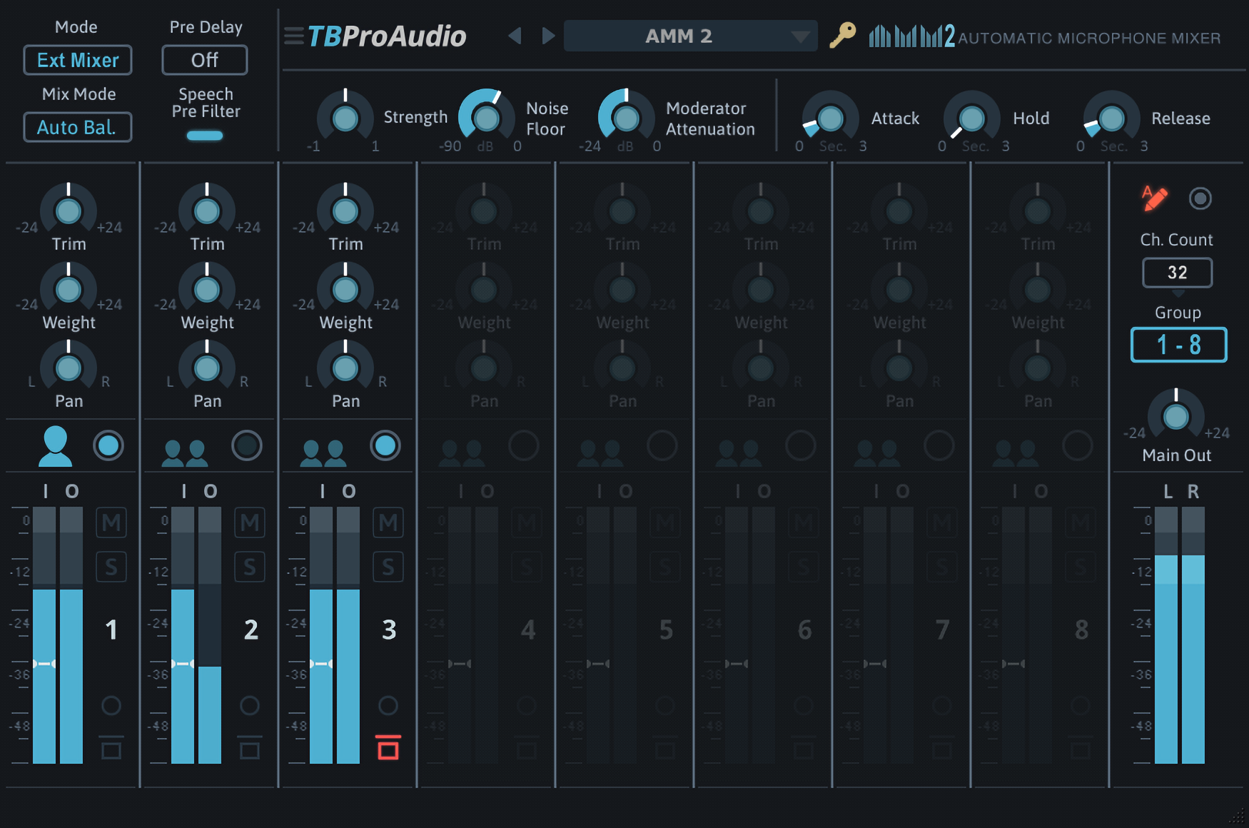 TBProAudio AMM는 최대 64입력(모노)/32스테레오 채널을 스테레오 2채널로 자동 믹싱해주는 오토믹서(VST/AU/AAX 플러그인)입니다. 회의, 패널 토론, 팟캐스트, 스튜디오 등 마이크가 여러 대 동시 사용되는 환경에서 노이즈, 잡음, 리버버레이션 등 잔소음을 최소화하고, 음성 신호만 자동으로 깔끔히 믹싱할 수 있도록 설계된 전문 툴입니다.