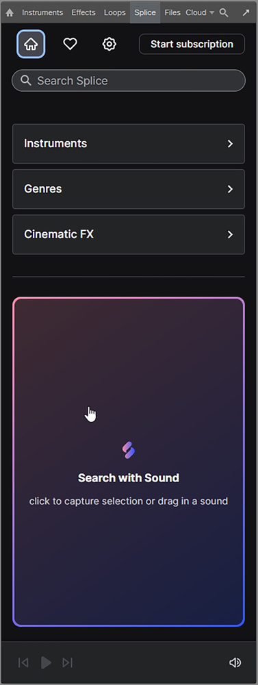 Splice와의 통합을 통해 Studio One 내에서 Splice 샘플 라이브러리를 검색하고 사용할 수 있습니다. Splice 통합은 브라우저의 Loops 및 Files 탭 사이에 'Splice' 탭을 추가하여 사용할 수 있습니다. “Search With Sound” 기능을 사용하면 클립을 드래그하여 AI 알고리즘이 사용 중인 트랙에 맞는 루프를 검색합니다. 검색된 루프는 템포와 키가 일치하며, 프로젝트에 바로 드래그 앤 드롭할 수 있습니다. Splice의 유료 구독이 필요하지만, 구독자에게는 매우 유용한 기능입니다. 무료 콘텐츠를 필터링하는 기능은 Search With Sound에서 사용할 수 없다는 단점이 있습니다.
