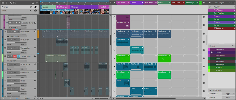 Studio One Pro 7에는 루프, 클립, 씬을 실행할 수 있는 Clip Launcher가 통합되어 있습니다. Clip Launcher는 Arranger 트랙과 함께 사용할 수 있으며, Logic Pro와 유사한 방식으로 트랙은 수평으로, 씬은 수직으로 배치됩니다. 클립을 셀에 드래그 앤 드롭하거나, Arranger 트랙에서 코러스를 가져와 자동으로 랙에 배치할 수 있습니다. Clip Launcher는 Splice 통합과 함께 사용하면 더욱 강력한 효과를 발휘합니다. 씬 재생 목록을 만들어 씬을 원하는 순서로 재생할 수도 있습니다.