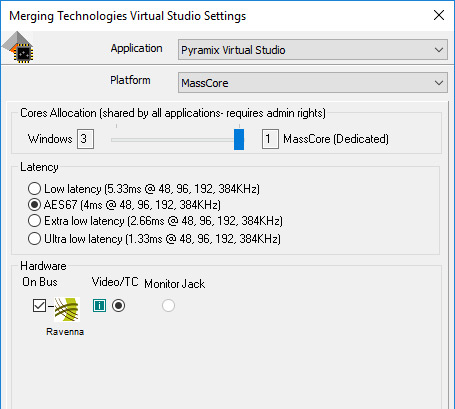 위 설정에서 5.33ms 는 ASIO Native로 사용할 때의 레이턴시, AES67 은, RAVENNA 네트워크 로 연결했을 시의 레이턴시, 그 밑의 extra low와 Ultra low latency는 Masscore를 설정하여 CPU를 DSP로 사용할 때의 레이턴시 이다.