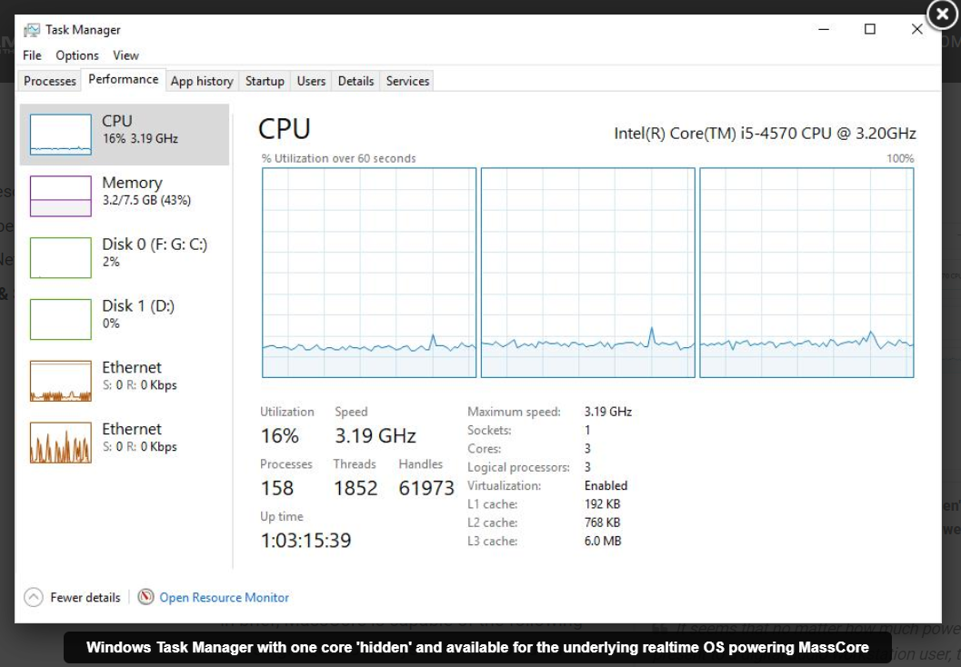 그림 2: 작업 관리자에서 사라저버린 코어 1개. 원래 이 CPU는 4개의 코어가 있지만 Masscore에서 1개의 코어를 Pyramix 전용의 Audio DSP로 사용한다.