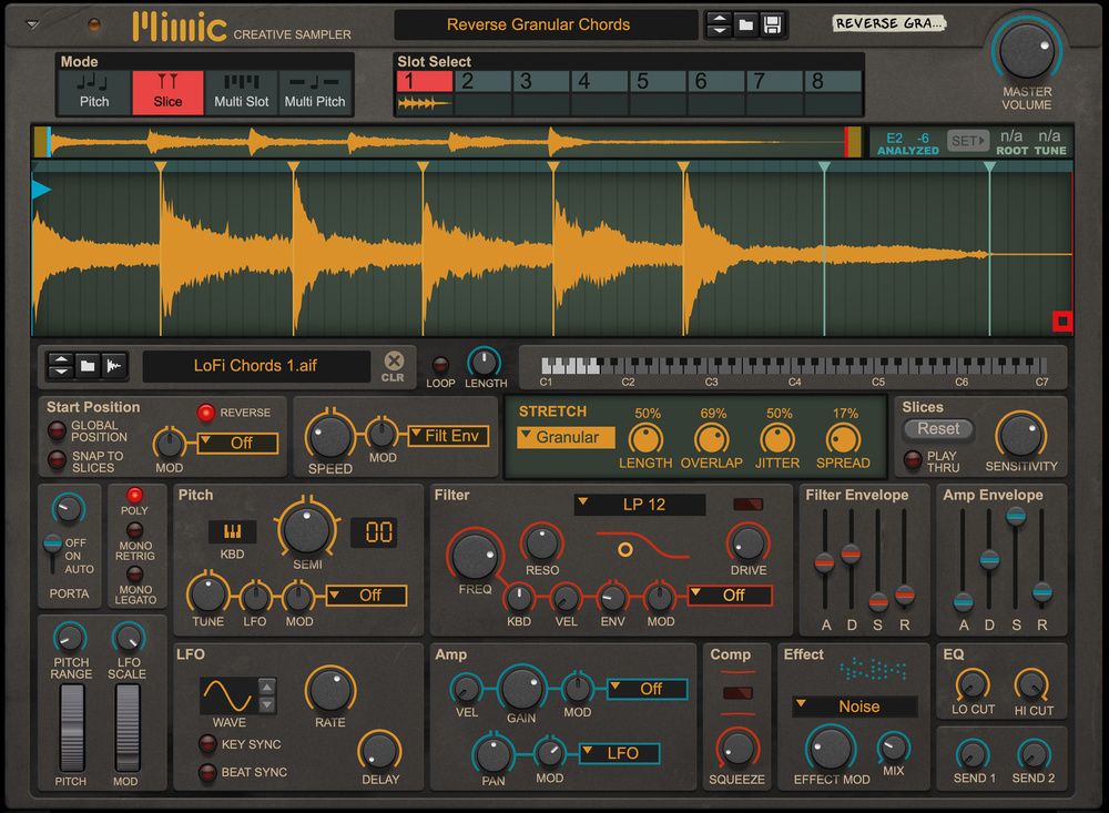 Reason 12는 빠르고 실험적이며 즉각적인 결과를 낼 수 있는 새로운 샘플러 악기인 Mimic을 소개합니다. Mimic은 샘플을 드롭하거나 직접 녹음하고 키보드에서 즉시 재생할 수 있는 가장 간단한 기본 모드(Pitch)를 제공합니다.