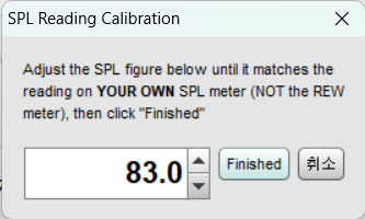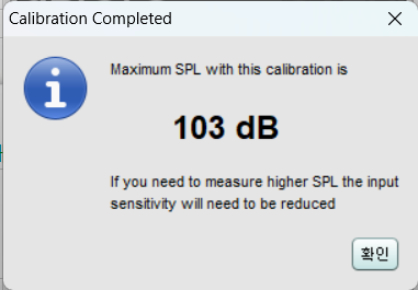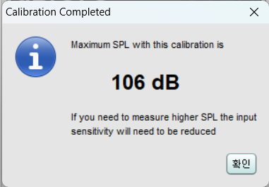 이 보정 과정은 매우 중요한 과정으로 REW 의 모든 측정 데이터에 영향을 끼치므로 꼭 캘리브레이션을 해야 하고, 캘리브레이션 결과 나온 MaxSPL 값은 스피커 시스템의 실제 스펙상의 MaxSPL과 같은 값이 나와야 한다.2) 또한, 모든 측정 데이터의 최대 dBSPL 은 해당 MaxSPL과 일치 해야 보기 편하다.